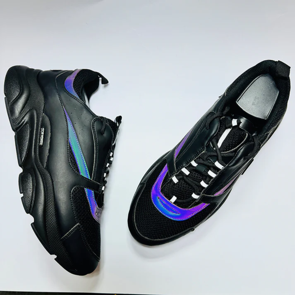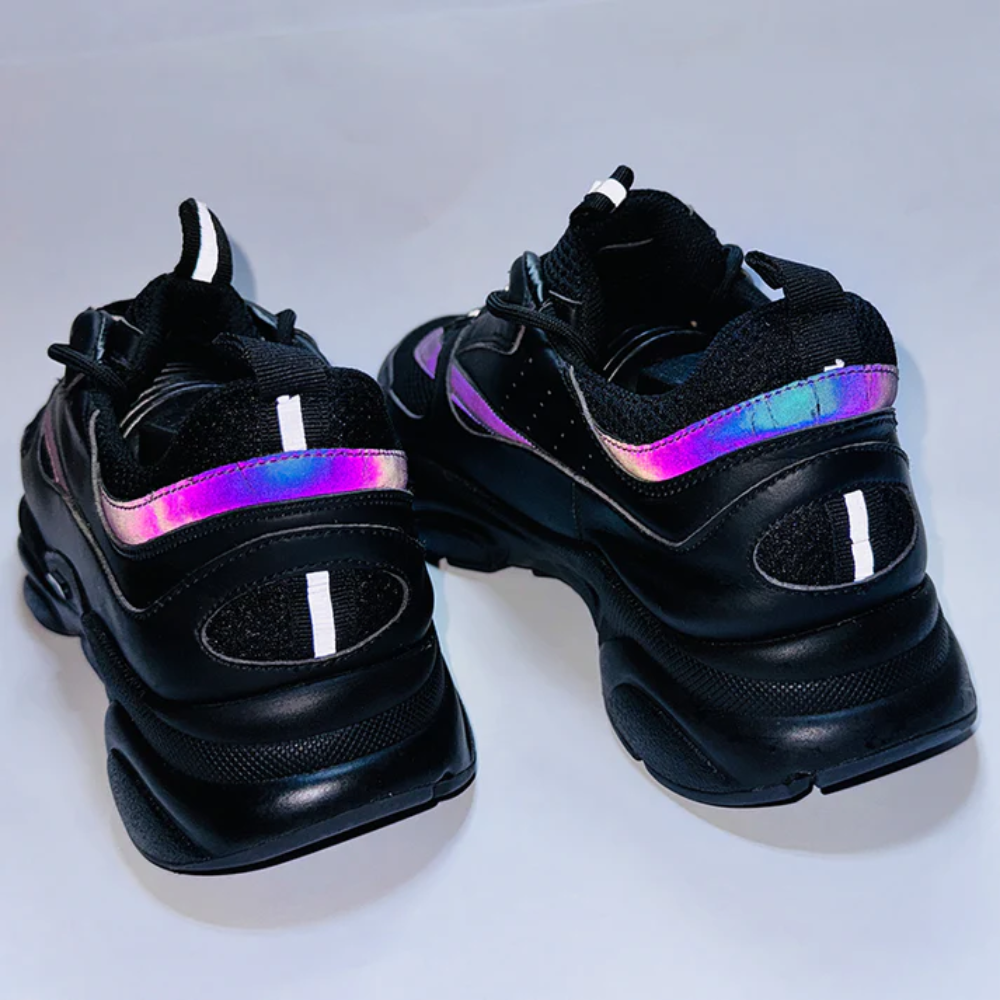 Crafted from a premium mix of mesh, leather, and technical materials, the upper delivers durability, breathability, and a structured high-fashion finish. The reflective accents enhance visibility and style, making these shoes perfect for both day and night looks.